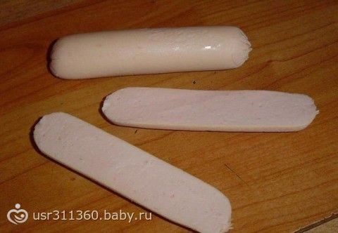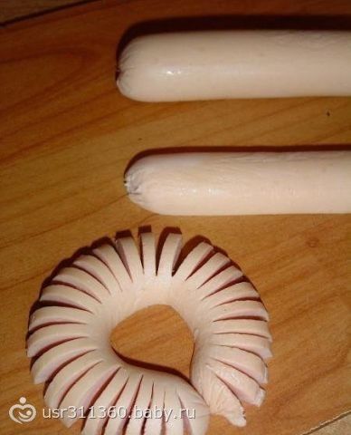 1. Сначала режем сосиски на две части вдоль, после с одной стороны надрезаем их по всей длине.