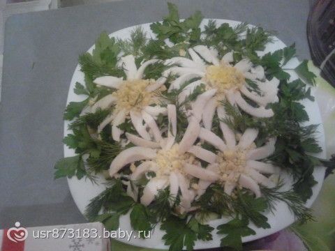 Вот, что получилось у меня. Я украсила по идее салата Ромашковое поле.