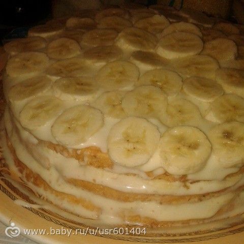 я просто на бисквитные коржи выкладываю масло+сгущенка и бананы колечками)) и так все слои))
