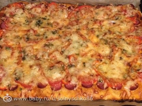 Вода 300 г, пакетик сухих дрожжей, соль и сахар по чайной ложке, три столовые ложки растительного масла, муки сколько возьмет. Замесить тесто и в теплое место на час-полтора, потом тонко раскатывать. Из такого количества выходит две большие пиццы. Выпекается быстро — минут 5-10
