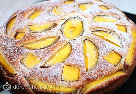 На дно формы выложить яблоки, вылить часть тетста.Сверху на тесто выложить кусочки ананасов, залить оставшимся тестом.Оформить кусочками манго.