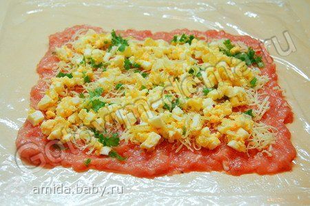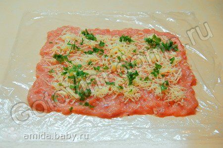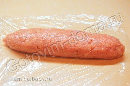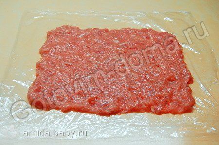 На пленку выложить часть фарша, равномерно распределить его по поверхности пищевой пленки, формируя, прямоугольник, размером ~10х15 см.