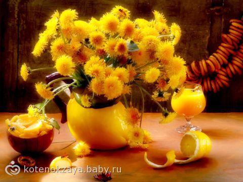 На 400 головок одуванчиков 1 крупный лимон и 1 кг сахара. Одуванчики отделить от всего зеленого, а желтые лепестки залить 1 литром воды, добавить разрезанный на 4 части лимон и варить 1-1.5 часа. Остудить, а еще лучше дать постоять ночь. Потом процедить, лепестки отжать. Лепестки выбросить, вареный лимон мелко порезать, а к отвару добавить сахар и варить, пока не загустеет. По консистенции должно получиться как жидкий мед. Кстати, это варенье является хорошим профилактическим средством при астме и бронхитах.