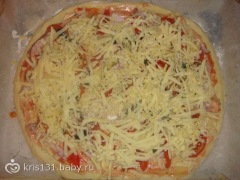 Поставить в разогретую до 200 гр. духовку на 20 мин. Потом выложить на пиццу кружки помидоров, посыпать петрушкой, тёртым твёрдым сыром, и печь ещё 5 мин.