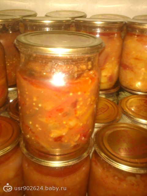 В томатный сок добавляем соль, растит. масло, сахар, уксус-ставим на огонь, доводим до кипения, добавляем чеснок, снова доводим до кипения, добавляем баклажаны и весь перец, тушим на маленьком огне 35-40 минут под крышкой. Раскладываем в банки и стерелизуем 30 минут, закатываем!
