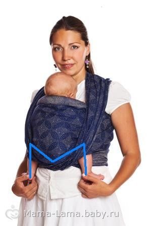 Нижний бортик проходит под коленками, коленки при этом находятся выше попы (!). Ребенок не лежит и не провисает в слинге, он притянут слингом к маме так же плотно, как если бы мама прижимала его к себе руками.