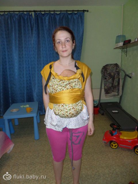 вот моя проба первая с вертикальным положением. Смущает положение ножек, т.к. спинка слинга очень широкая. И еще не фиксируется никак голова… или я что-то не так делаю?