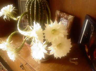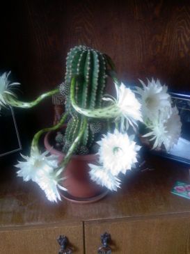 Мой кактус цветет каждый год, выпускает по 1 цветочку, очень редко когда два, а в этом году он как сумасшедший начал каждый месяц цвести. И в день нашей свадьбы 21 августа сделал мне подарок вот такой, я была в шоке, это в первый раз с ним такое. (Пы.Сы. Извините за качество фото, оно сделано на телефон)
