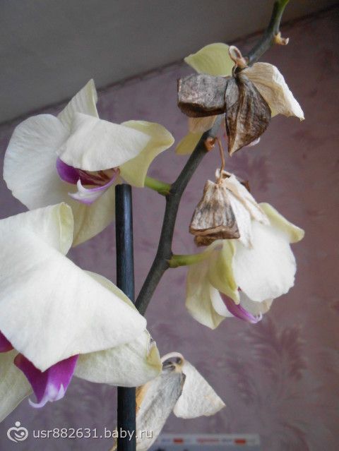 в общем у меня 4 орхидеи, стоят в одном месте кучкой. у 3 орхидей листья стоят как надо, у 4ой капец морщинятся и вялые… она цвела, цветы позавяли, висят пока не опадают, сама их не отрываю, и главное не просто висят а еще и некоторые бутоны почернели… че к чему? и кстати листья потрескались пополам…