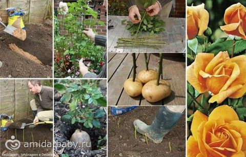 Этот способ разведения роз не трудоемкий, а результат получается великолепный. Итак, разведением роз обычно занимаются в июле месяце. В это время у розы отрастают новые побеги. Выбираем толстенькие побеги, размером с карандаш. Отрезаем секатором побег и нарезаем их на черенки — 20-25 см. Нижний срез делаем под углом 30 градусов, верхний прямой. Оставляем 2 листочка. Заглубляем черенок в картошку. Копаем траншею для посадок на штык лопаты- 20 см. На дно траншеи насыпаем песок. Укладываем черенки в картошке на расстоянии 15 см друг от друга. Засыпаем черенки землей так, чтобы они были заглублены и закрыты 2-3 почки у черенка розы.