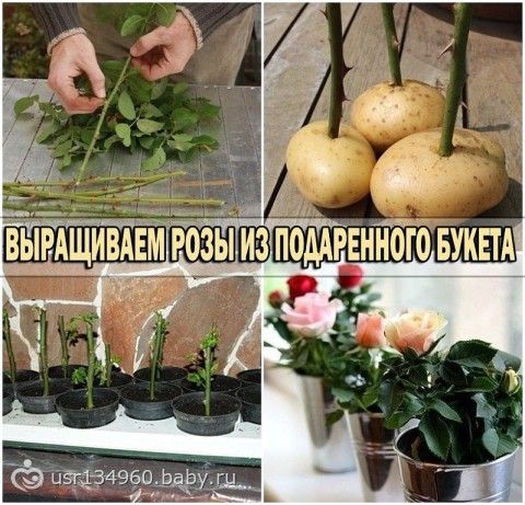КАК ВЫРАСТИТЬ РОЗУ ИЗ БУКЕТА. 1. С цветков из букета удалите листья и цветы, нарежьте черенки длиной 25-30 см. Каждый черенок смочите водой и прижгите его концы крепким раствором марганцовки. 2. Замочите черенок полностью в розовом растворе марганцовки на сутки. 3. Посадите черенок в землю так, чтобы вторая почка оказалась на поверхности. 4. Накройте горшок с черенком банкой или полиэтиленом. 5. Следите, чтобы почва была все время влажной. Но полив должен быть умеренным, иначе роза может заболеть мучнистой росой. 6. После появления первых листьев перенесите растение поближе к свету. Если во время роста черенка будут появляться бутоны, их нужно удалять, чтобы у розы развивались корни. Почву роза любит питательную, состоящую наполовину из перегноя. Когда начнет формироваться куст, обрезайте ответвления, оставив 4-5 самых сильных побегов. КАК ВЫРАСТИТЬ РОЗУ В КАРТОШКЕ. Роем траншею на открытом хорошо освещенном грунте. в защищенном от ветра месте и засыпаем песком Эта траншея должна иметь одну вертикальную сторону. и около 6 дюймов (15 см) глубины; в которую насыпаем на дюйм или два на дно песок. Летом, в самый разгар цветения, у роз появляются хорошие молодые побеги, которые немного наклонно отрезаем секатором.Желательно выбирать побеги толщиной с карандаш, которые более стойко будут размножиться. Побеги должны быть прямые. без изгибов.Нарезаем их на черенки около 9 дюймов (23 см) в длину. Удалите листья и шипы из нижней половины. Вы можете оставить пару листьев в верхней части черенка, но садовод удалил.Осталось только утоптать все место около черенков и поливать все лето для укоренения. А вся фишка в том, что эти черенки надо воткнуть в молодую картошку, которая будет постоянно держать их во влажной среде!!! Благодаря этому способу черенки хорошо укореняться и в конце лета будут готовы к пересадке Весь секрет качественной рассады именно в скромной картофелине, благодаря которой Вы получите отличную на две трети надо углубить черенок в землю, поэтому вставляем их на 15 см друг от дружки в траншею с песком и засыпаем их сверху черноземом… Пока все обычно, не так ли?.. Осталось только утоптать все место около черенков и поливать все лето для укоренения. А вся фишка в том, что эти черенки надо воткнуть в молодую картошку, которая будет постоянно держать их во влажной среде!!! Благодаря этому способу черенки хорошо укореняться и в конце лета будут готовы к пересадке Весь секрет качественной рассады именно в скромной картофелине, благодаря которой Вы получите отличную рассаду!!!