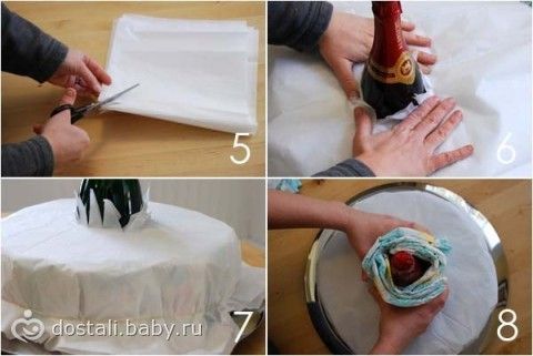 1. Предлагаем стержнем торта сделать бутылку шампанского. Родителей ведь тоже нужно поздравить! Итак, поставьте бутылку шампанского на поднос. Распакуйте пачку с подгузниками и каждый скрутите в трубочку и закрепите с помощью резинки от денег. Сворачивать нужно с более толстого края.
