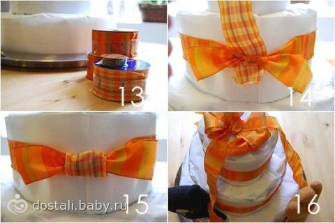 5. Теперь каждый слой нужно обернуть широкой атласной лентой, чтобы скрыть резинку, стягивающую подгузники. Так как ленты не такие широкие как подгузники, то сделайте их в два ряда, скрепляя между собой двусторонним скотчем. Вместо ленты можно обернуть слои сложенными полотенцами или пеленками.
