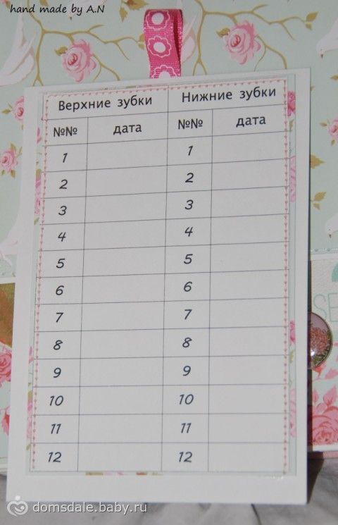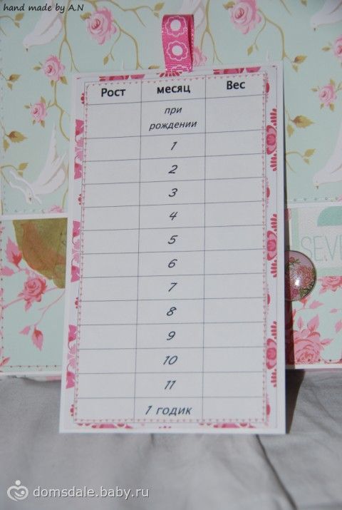 (по обложке)на 6 листов. Альбом первого года жизни в котором разместились 12 месяцев, страничка Первых дней и страничка с семейным фото 13-18. Все фотографии в альбоме 10-15 см, всего их 34 штуки. Так же есть график рост-вес и табличка с зубками)))