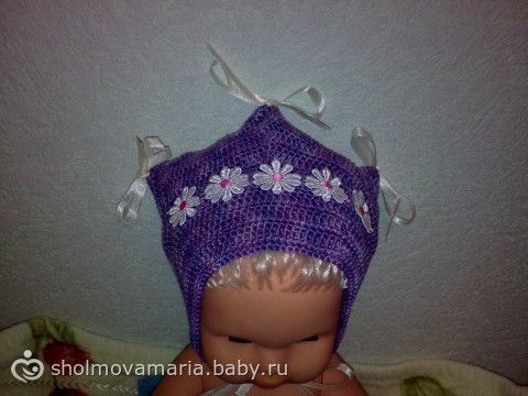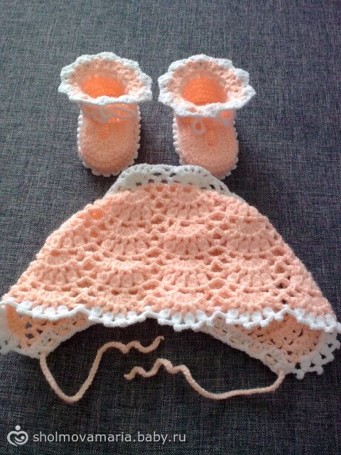 Спасибо!!! Вязала пинетки по этой схемке, обвязку верха пинеток брала в инете, схемка чепчика персикового есть выше, а чепчик с ромашками наберите в поисковике «чепчик „розовое очарование“», он там самый первый в поиске.