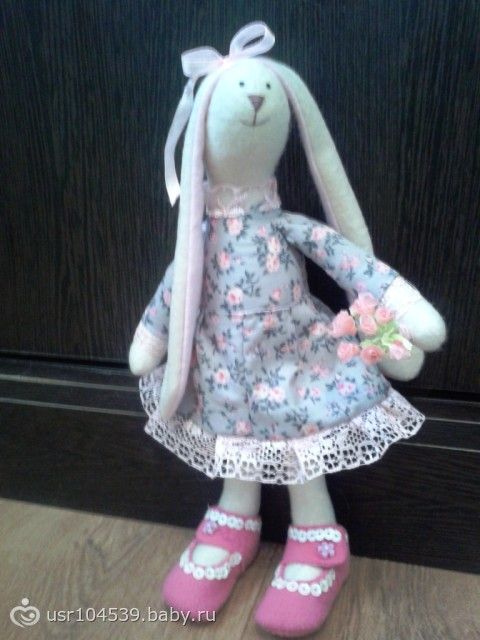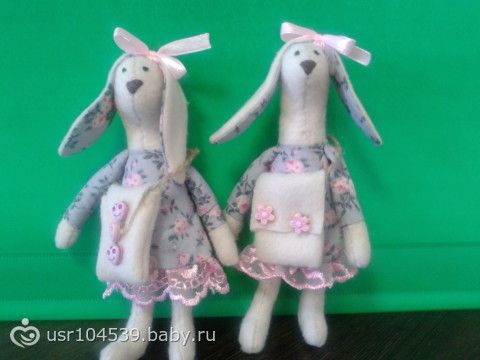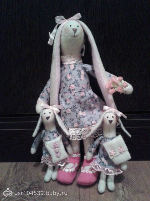 Сегодня познакомьтесь с Зайкой Розочкой и ее детьми — близняшками. Обычно при знакомстве с ними у всех возникает вопрос «где их папа?»)) Поскольку папу я не сшила( может когда то и сошью), то я думаю, что сейчас он на работе, в длительной командировке)) Это не мешает Розочке развлекаться с детьми. В общем, развлекаются и ждут папу с командировки ( командировка закончится, когда я найду ткань такого же цвета и когда вдохновение появится))