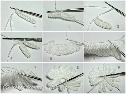 Для лепестков набрать цепочку из 13 вп. Начиная с 3-й от крючка петли, провязать 1 стбн, 1 пстсн, 7 стсн, 1 пст сн, 1 сбн (фото 1). Повернуть вязание и обвязать лепесток по периметру соединительными столбиками (фото 2). В торцевую петлю провязать 2-3 столбика, чтобы не стягивать полотно. Первый лепесток готов. Не обрывая нить, связать цепочку из 13 вп для 2-го лепестка (фото 3). Выполнить его в точности как первый. Всего связать 15 лепестков. В результате получится связка из 15 элементов, в которой каждый лепесток частично накладывается на предыдущий (фото 5). Связать 1 вп для подъема. Основания лепестков обвязать стбн таким образом, чтобы каждый столбик скреплял левую половинку одного лепестка с правой половинкой предыдущего (фото 6, 7, 8). Всего получится 15 стбн, по числу лепестков. Закончив обвязку, замкнуть деталь с лепестками в кольцо и продолжить вязать стбн, равномерно выполняя убавки до тех пор, пока отверстие в центре полностью не закроется (фото 9). В первом ряду пять раз повторить: 1 стбн – 1 убавка. Во втором ряду 5 убавок. На всякий случай напомню, как выполнять убавки: ввести крючок под обе полупетли столбика предыдущего ряда, вытянуть нить, не провязывать, ввести крючок под обе полупетли следующего столбика, вытянуть нить, провязать все три петли на крючке. Та сторона, на которой находятся концы нитей — изнаночная.