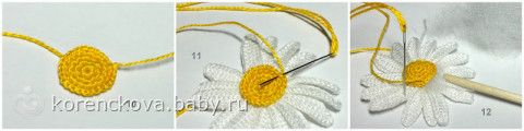 Желтая серединка (фото 10) вяжется по спирали столбиками без накида с равномерными прибавками: 6-12-18-24. Крючок вводится под обе полупетли. Для прибавки из петли предыдущего ряда вывязывать по два стбн. Первый ряд: 6 стбн в скользящую петлю (петлю амигуруми). Второй ряд: 6 прибавок. Третий ряд: прибавка — 1 стбн (повторить 6 раз). Четвертый ряд: 2 стбн — прибавка (повторить 6 раз). Обрезая нить надо оставить достаточный по длине конец, чтобы пришить серединку к лепесткам (фото 11). Чтобы серединка была выпуклой, можно набить ее наполнителем (фото 12). Вывести нить на изнаночную сторону, все концы связать узлом и обрезать.