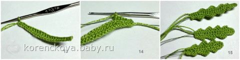 Для листа набрать 22 вп. Начиная с 3-й от крючка петли провязать 2 стбн, 3 пстсн, 10 стсн, 3 пстсн, 2 стбн (фото 13). Развернуть вязание, приложить к краю детали зеленую проволоку длиной около 25 см. Деталь обвязать по периметру вместе с проволокой следующим образом: