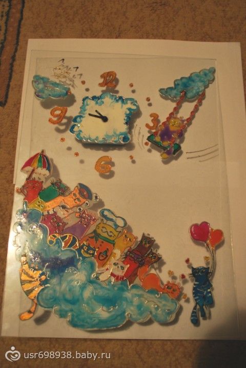 Поскольку первая работа, то с креплением часиков вышел прокол, т.к. не продумано, но они, как я знаю, успешно стоят на полочке и тикают)