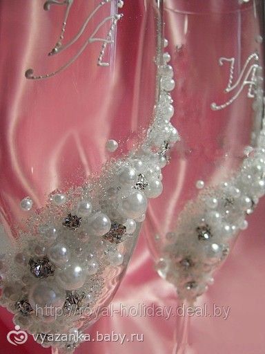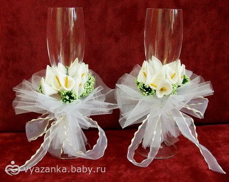 пожалуйста)) Я на шампанское одевала костюмы, а фужеры — мы пили из них за свадебным столом. А еще нужны бокалы, которые разбивают у ресторана, я брала просто прозрачные, чтобы на счастье разбить, на них по-моему что-то наклеила небольшое. у ресторана и разбили…