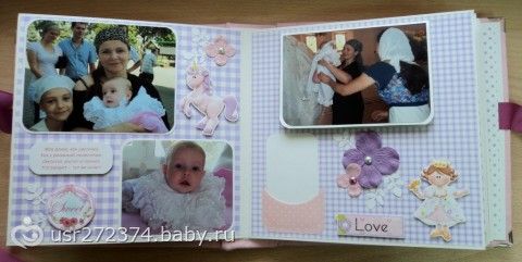Ну и насчет украшений — цветочки бумажные, половинки жемчуга, кружево, надписи и стихи — все это дополнит альбом. Картинки вы прекрасно можете сделать сами — в интернете нашли (только опять же, не разнобойные, а сочетающиеся между собой. Если надо я Вам могу скинуть). И материалы лучше приобретать в специальных магазинах (кроме кружева, ленточек и прочей фурнитуры). Выдерживайте один стиль (если яркий — то яркий, если нежный-то нежный). Чем больше-тем лучше — это не про скрапбукинг) Вышеприведённые примеры страничек я делала из одной бумаги (вся сиреневого цвета, только узор разный: горох, клетка, полоски, сердечки). Картинки распечатывала сама.