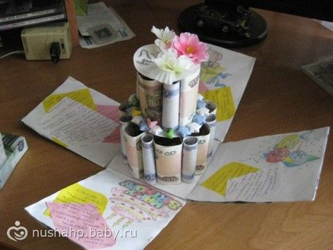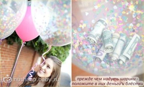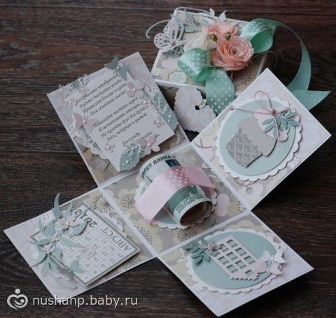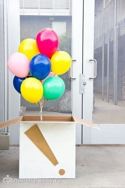 концы нитей шарика приклеены к дну коробки, к ниточкам приклеена открытка
