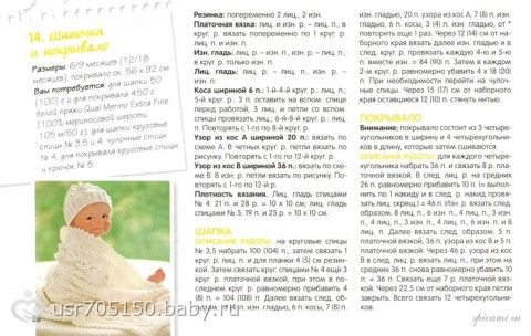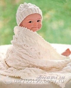 Теплый и большой плед с разнообразными узорами из кос. В него так просто завернуть малыша. Этот же узор повторяется и на шапочке. Описание дано на ребенка 6-12 мес., но рассчитав плотность вы без проблем сможете увеличить модель до нужно вам размера.