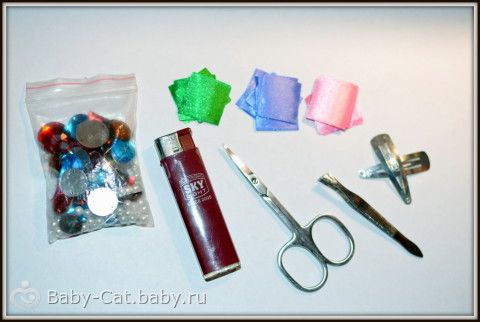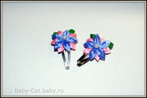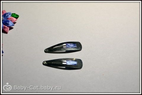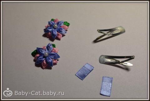 Наши цветочки готовы и их можно крепить к заколкам, для этого нам понадобятся самые обычные заколки и небольшой отрезок ленты.