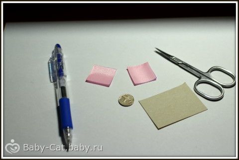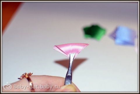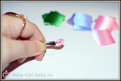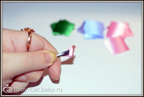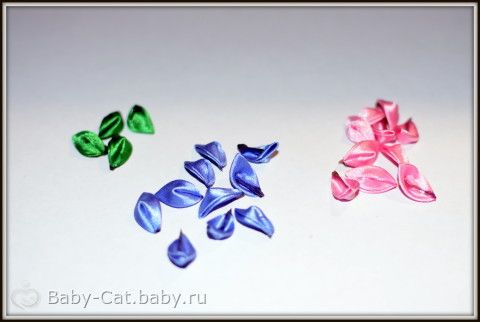 1) лента шириной 25 мм розового, сиреневого и зелёного цвета, которую мы нарезаем на равные квадраты по 10 розовых и сиреневых и 4 зелёных.