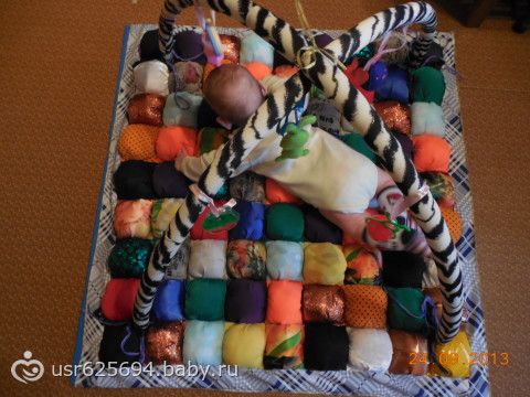 спасибо! для более старшего возраста уже другая задумка (увидите через полгодика). а этот на сейчас теплый к полу, мягкий, чтоб не ударился пока на бок заваливается и разные погремухи можно менять