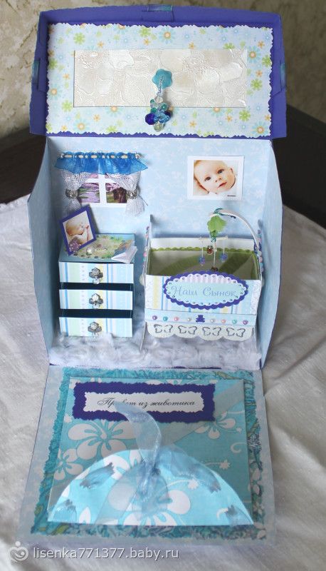 Коробочка — хранилище самого ценного для мамы и папы) В маленький комодик можно положить бирочку из роддома, прищепочку с пупочка, первый локон и зубик, ленточку с выписки и т.п., в кроватку можно положить соску (так же можно использовать для денежного подарка к новорожденному, положив денежку в кроватку). В конверт на стеночке можно положить диск с записью УЗИ и фотографиями первого года.