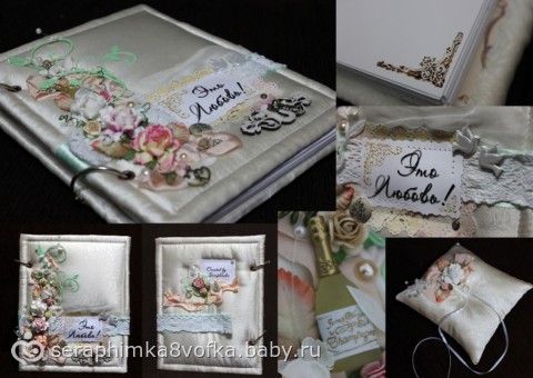 Посты в журнал пишу не часто. Но на днях опубликую запись о детках своих, будет 3))))Свадебная книга для пожеланий, можно вклеить и фото + подушечка для колец.