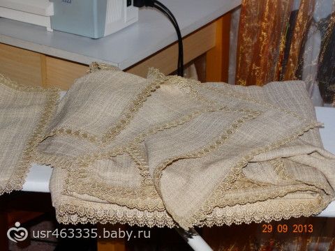 ткань — лен, но не скатерная, а костюмная, но мне понравилась и для скатерти :) я искала под цвет обивки стульев (родители новые купили), а была в гамма тканях (на Павловском тракте, возле Европы) и случайно увидела в распродаже эту ткань, она мне обошлась по 100 руб. за метр :) что очень дешево, конечно. Сложнее оказалось подобрать в цвет кружево (сложнее, чтобы в наличии метраж был, мне надо было 22 метра).