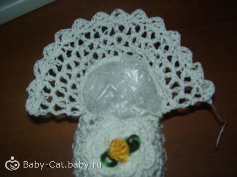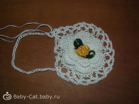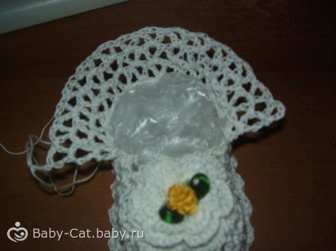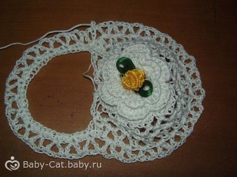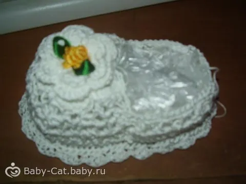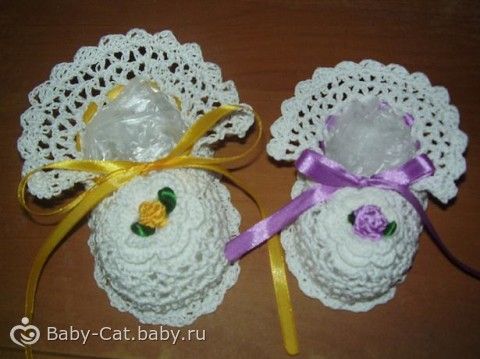Для вязания этих пинеток я использовала следующие материалы нитки 100% хлопок «Ромашка» крючок № 2(2мм.) так же около 2 м. жёлтой атласной ленты ширина 1см. и небольшой кусочек примерно 10 см. зелёной атласной ленты шириной 1 см. (это с учетом изготовления розочек) (для завязок вполне хватит 1 м.)