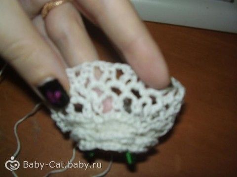 8р. Вяжем цепочку из 40 в.п. пропускаем 4 арки из 3х в.п. ст. б\н в ст. б\н (главное надо смотреть, что бы эта цепочка не перекрутилась) 3 в.п. ст. б\н в середину арки (у меня получилось 40 в.п. и 18 арок из 3х в.п.)