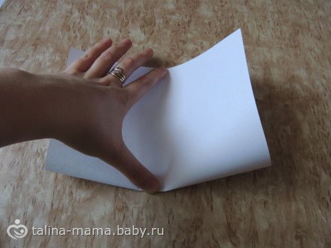 Складываем лист А4 пополам, состыковывая уголки, загибаем и разглаживаем руками загиб, начиная от середины (если от края, то может сместиться)