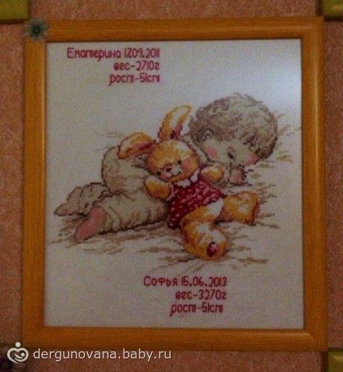 А на днях закончила метрику! У нее вообще длинная история, начала вышивать, когда Кате полгодика было, потом забросила… А недавно Аня (мама Димы) спросила, где купить нитки мулине и меня как громом поразило хочу-хочу вышивать!!! И так как теперь у меня еще и Соня есть, сделала на двоих)