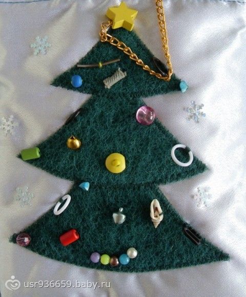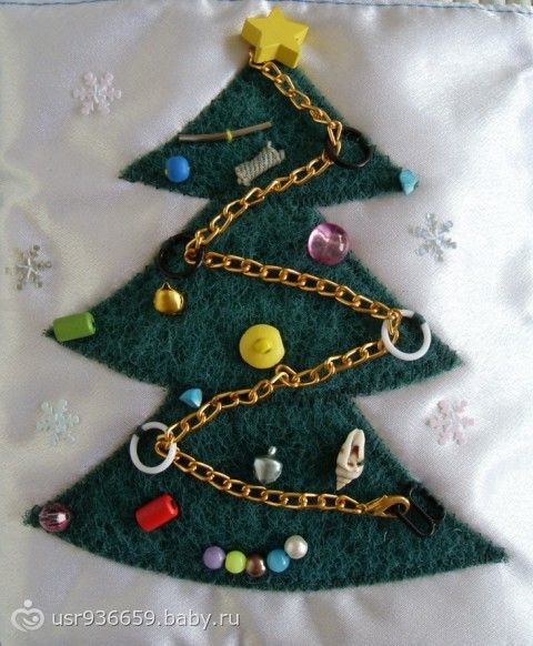 Ёлка. Наряжена бусинками, бубенчиками и гирляндой-цепочкой. Когда будут постарше — цепь нужно продеть в колечки