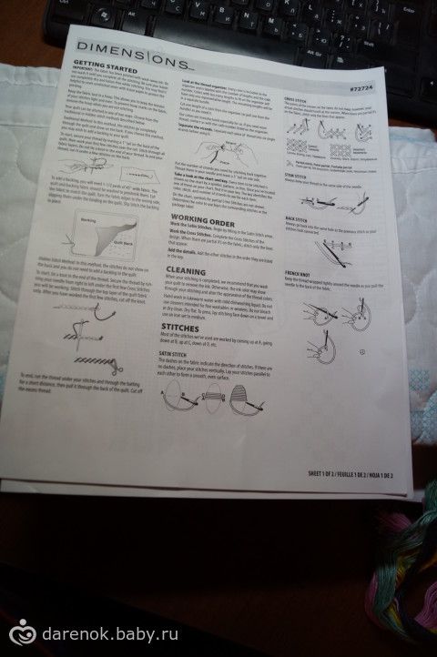 Вот описание на русском как нужно вышивать — 2 варианта — либо прошивать одеялко насквозь, либо скрытым способом. но второй вариант мне показался не реальным.
