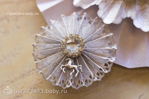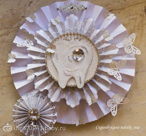 Сам зубик проработан в первую очередь белой пудрой для эмбоссинга, контуры выделены перламутровым белым сухим глиттером, укреплены лаковым слоем глосси-акцента. Контур выделен серебристым пигментом (заторцован), так как белый зубик и светло-золотистый фон фактурного перламутрового картона так и норовили слиться. Ну и, конечно, стразы — они всюду! И как инкрустация самого зубика, и как подчеркивание его контуров, стразовой цепочкой выделен контур круга-подложки из фактурного картона, сердцевина маленькой гофро-гирляндочки снизу слева, середины бабочек.