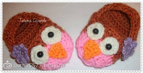 спасибо)))вы знаете я их без схемы вязала.там сначала круг вяжете по размеру ножки, дальше без прибавок на длину носочка, потом рядами до длины ножки, а сзади крючком связываете и обвязка.украшение по вкусу)))если вязать ст/б/нак то такие тапочки, если ст с нак то совушки)))