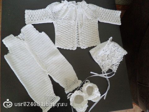 Вот такой комплектик я вязала своей крохе на выписку: распашонка, комбезик, пинетки, чепчик и пледик