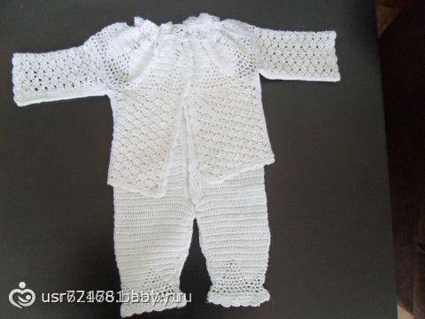 Это хлопковые нитки-тоненькие. Под низ одевали бодик и ползуночки, а сверху вязанное
