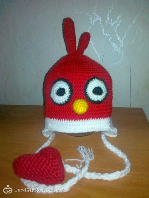 Только вариант я связала доброй птички, Русланчик такой маленький, что сердитая птичка нам не подошла, я пробовала сдвинуть глазки и пришить брови.Окончательный вариант вам на обсуждение)