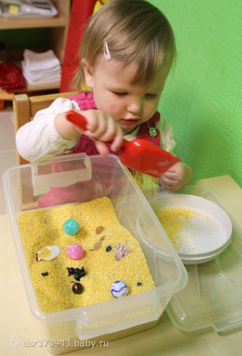уже попробовали мы сегодня такое занятие, ребенок не надолго увлекся выкапыванием игрушек, больше понравилось крупу пересыпать