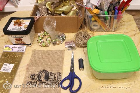 Необходимые материалы: пластиковый контейнер желательно прозрачный с плотно прилегающей крышкой, для оформления мешковина (у меня с 2 бутылок вина «Монашеский орден»), шнур-бечева почтовая, кружева, контурные наклейки на морскую тематику, маркер золотой для проработки деталей наклеек, клеевый пистолет со стержнями, нитка-иголка, подвески тематические, ракушки и другие украшения на Ваше усмотрение для самого конейнера; также подходящие объекты для самих занятий — крупные бусины, подвески, фигурки и тд.