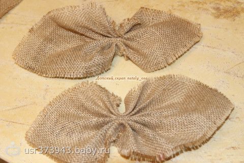 Вырезаем прямоуголькики из мешковины таким образом, чтобы диагональ отреза соответствовала или была чуть длиннее диагонали крышки контейнера. Складываем гармошкой с одного конца до противоположного, закрепляем ниткой-иголкой. Аналогично поступает с другим отрезом.