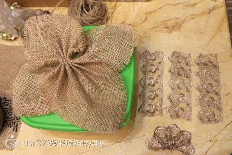 Примеряем базовый декор к крышке. Прошиваем элементы из мешковины друг к другу крест-накрест. Для выглядывающих участков с 4 сторон контейнера берем отрезы кружев подходящего цвета, отмеряем на глаз — я отмеряла 5 секций повторяющегося узора, чтобы сложенный гармошкой и прихваченный иголкой-ниткой кружевной элемент был симметричен.