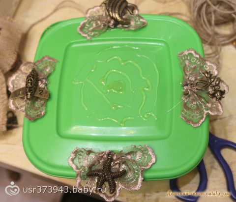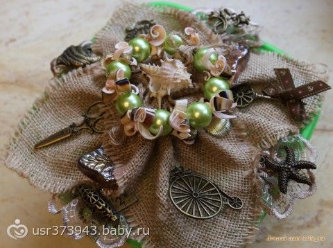 Если подразумевается дополнительный декор, как у меня в виде ракушки большой по центру, перламутровых ракушек-пайеток по бокам от центра, а также браслет из бусин и ракушек вокруг основной центральной ракушки, эти элементы лучше нашить на мешковину до приклеивания к контейнеру. Кстати, браслет я прикрепила на шнур почтовый в нескольких местах просто продев его сквозь мешковины (увеличив зазор ножкой ножниц) и завязав простым бантом. С тем чтобы потом можно было безболезненно снять этот аксессуар и отдать его доче носить на море к примеру ))) Также с помощью большого количества горячего клея закреплены листики из стекла для фьюзинга.